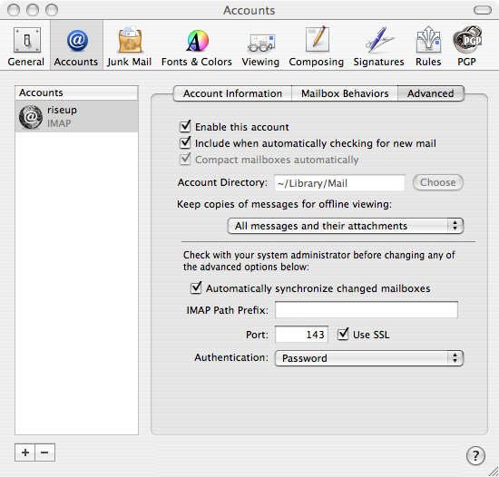• To enhance connection security you can use Onion Service configuration to connect to Riseup’s .onion services for IMAP and SMTP. Look for the onion address for mail.riseup.net and smtp.riseup.net addresses and use those instead. Note: * SMTP port 465 is often blocked by exit nodes, but port 587 is less frequently blocked. If you have a problem sending mail, try port 587 or configure your client to use Riseup’s email hidden service in place of the regular mail.riseup.net domain. This is better than sending traffic through a Tor exit as it is MITM resistant, but it will generate certificate errors on the client side.